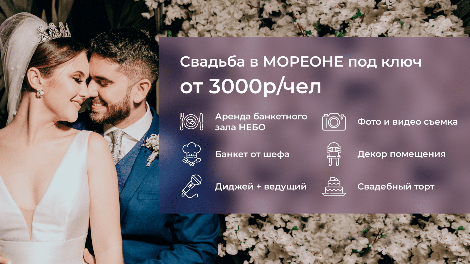 Если вы мечтаете о безупречной свадьбе — обращайтесь в Мореон. Оставляйте заявку или воспользуйтесь калькулятором стоимости на сайте. Мы возьмем на себя всю организацию свадьбы, а вам останется лишь наслаждаться моментом и ловить влюбленные взгляды друг друга!