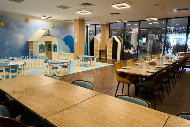 предлагаем банкетную зону «Порт» с европейским меню. Широкий выбор блюд, включая детское меню, аниматор, игровая зона, развлекательная