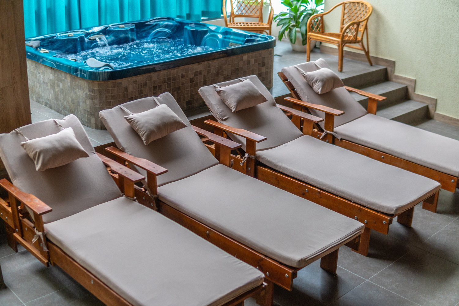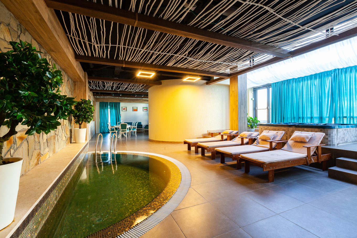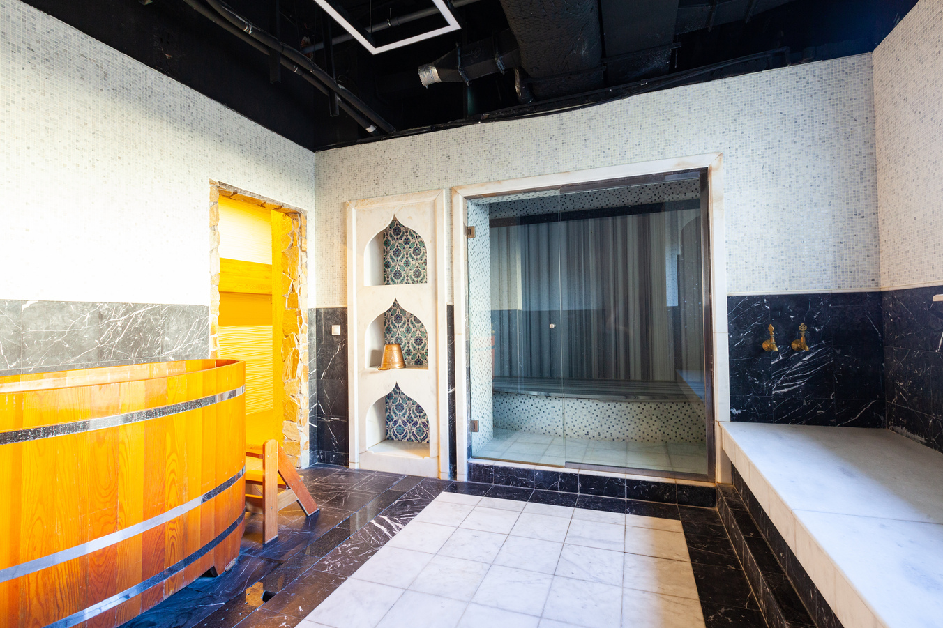 хаммамом, джакузи и бочкой-купелью. В помещении оборудована изысканная банкетная