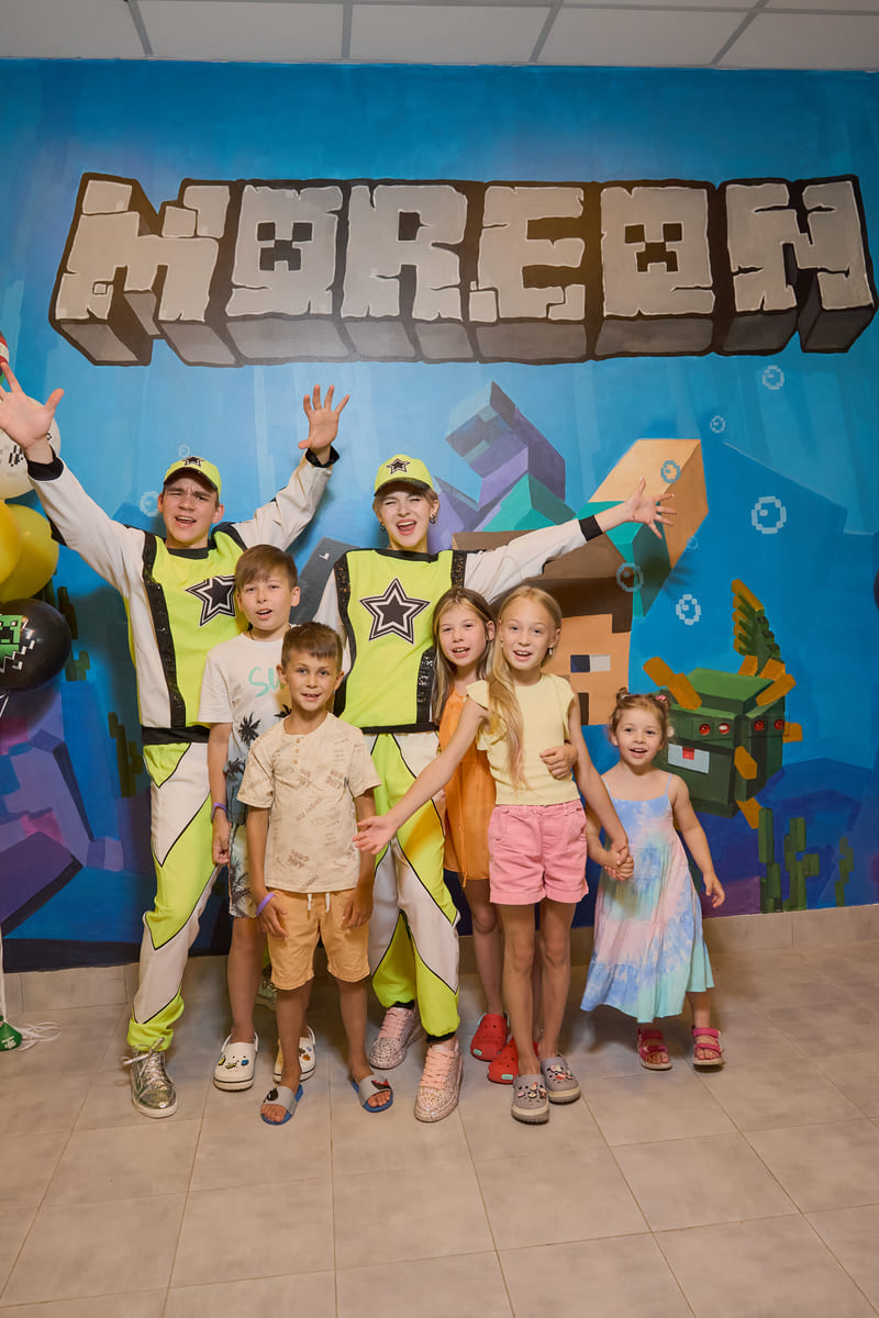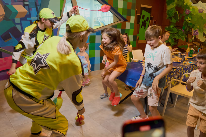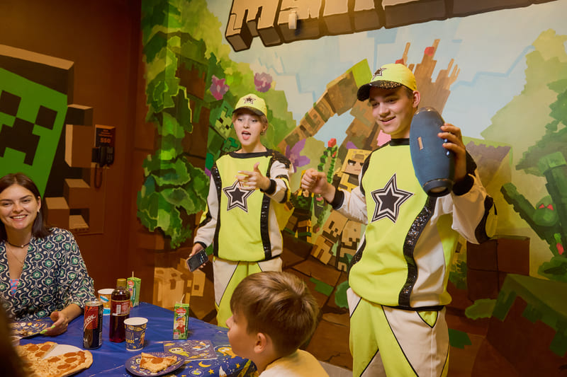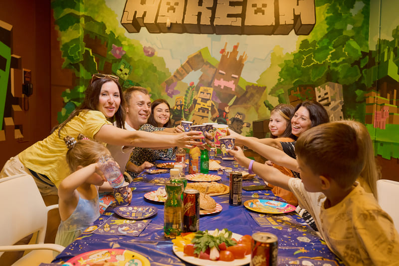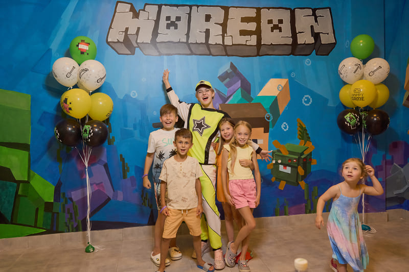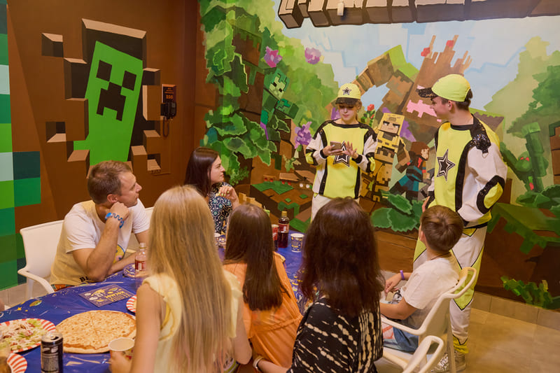Наши художники создали компьютерный мир, в виде банкетной комнаты, в аквапарке по мотивам игры Майнкрафт, уверены, что ни один ребенок не останется равнодушным!
