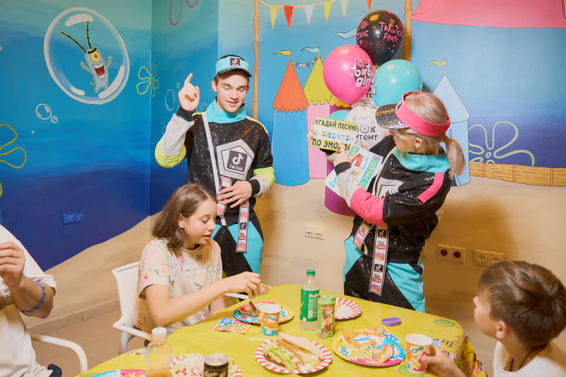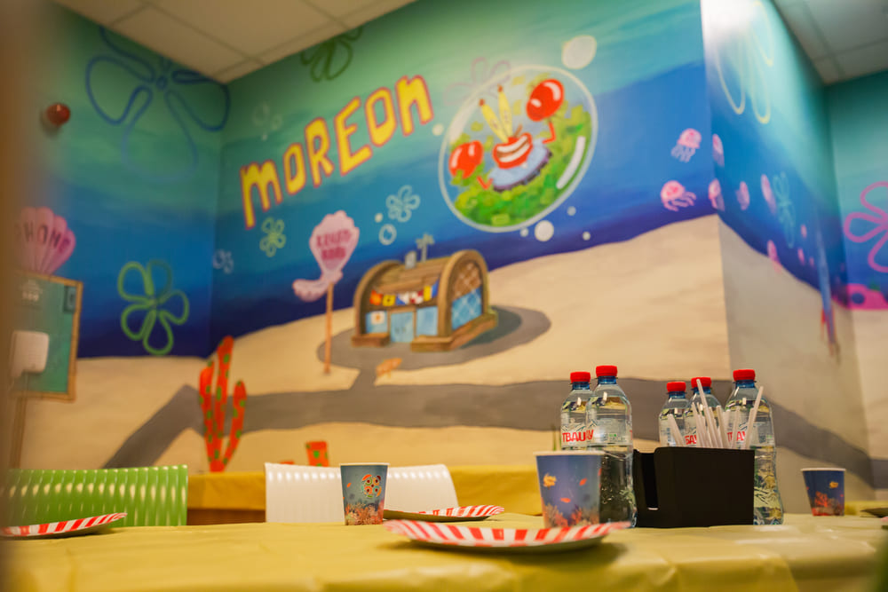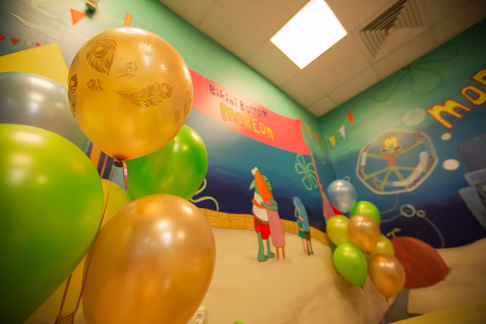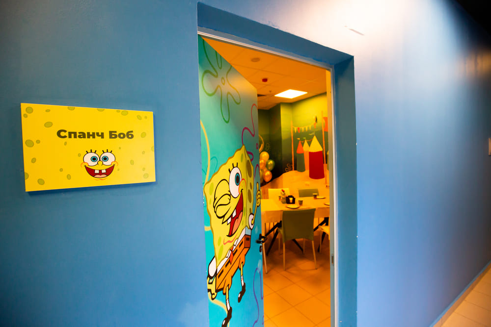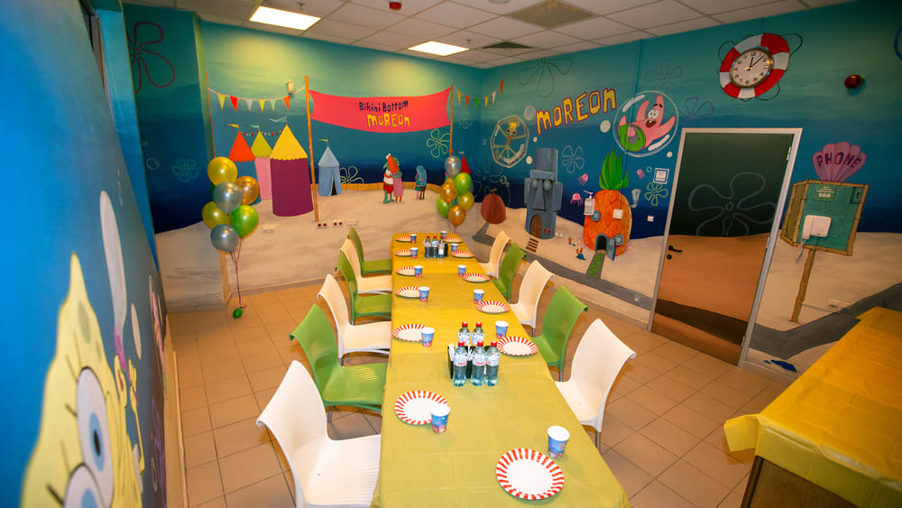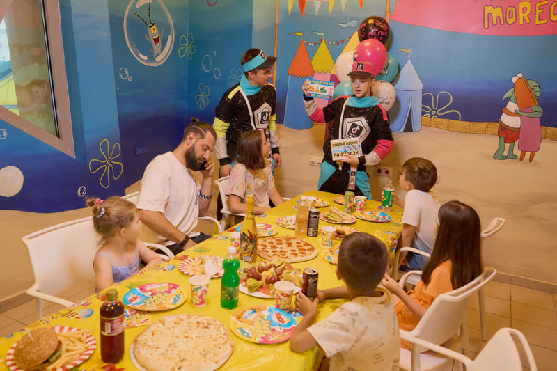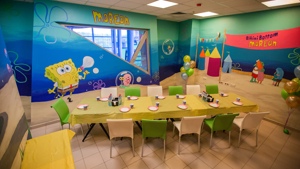 Новая банкетная комната оформлена в стиле одноименного мультфильма, где наши гости могут встретиться со всеми героями Бикини Боттом! Из комнаты открывается прекрасный вид на весь аквапарк! Уверяем Вас, что тут получаются самые крутые фотографии праздника, а менеджеры ивент отдела помогут сделать его по-настоящему атмосферным и незабываемым!
